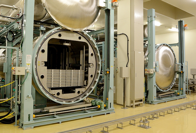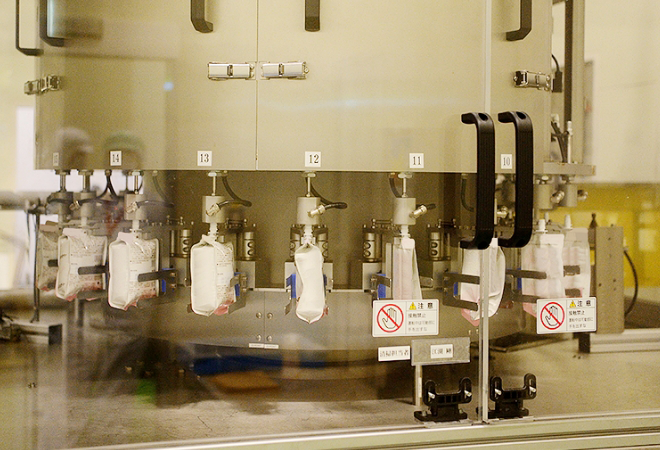 トーアスの濃厚流動食ラインは、2タイプの濃厚流動食(半固形・液体)を製造することが出来ます。粉体溶解設備が充実しており、インラインでスパウトを溶着する容器成型なので、安全性も保証できます。